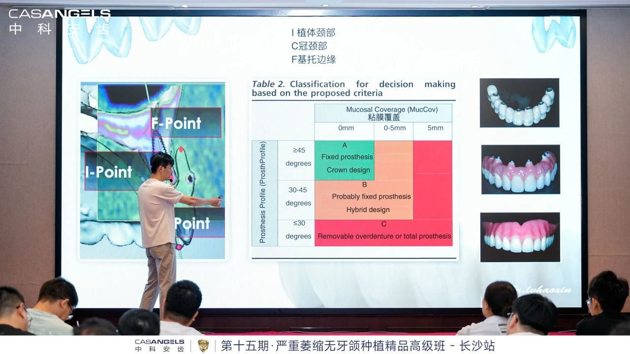 讲解即刻负重流程时,吕昊昕院长从循证考量到风险控制,细致梳理临床全环节;并剖析无牙颌临床分类与手术技巧,对轴向/倾斜种植设计、穿翼/穿颧种植实操要点逐一精讲,构建起“外科程序-最终修复”完整知识图谱,帮助学员精准掌握无牙颌种植的核心理论。