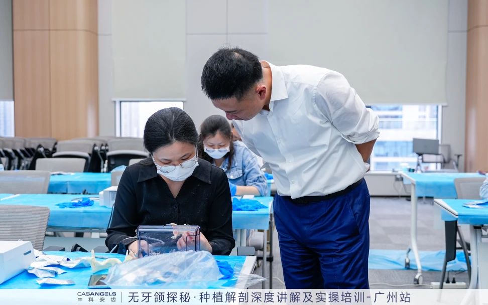 陈毅博士现场实时指导,针对操作细节逐一纠正并提出建议,确保学员们精准掌握无牙颌种植技术要点,实现理论知识向实践能力的高效转化。