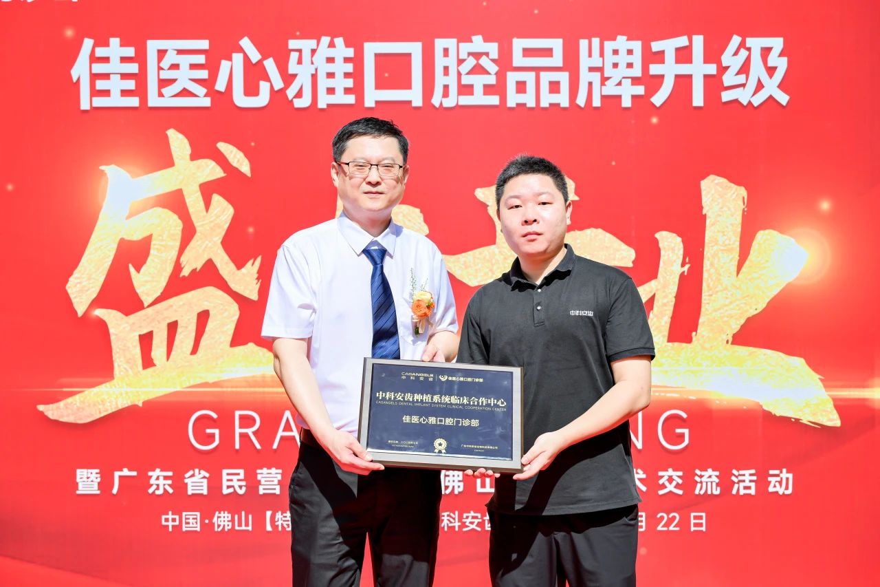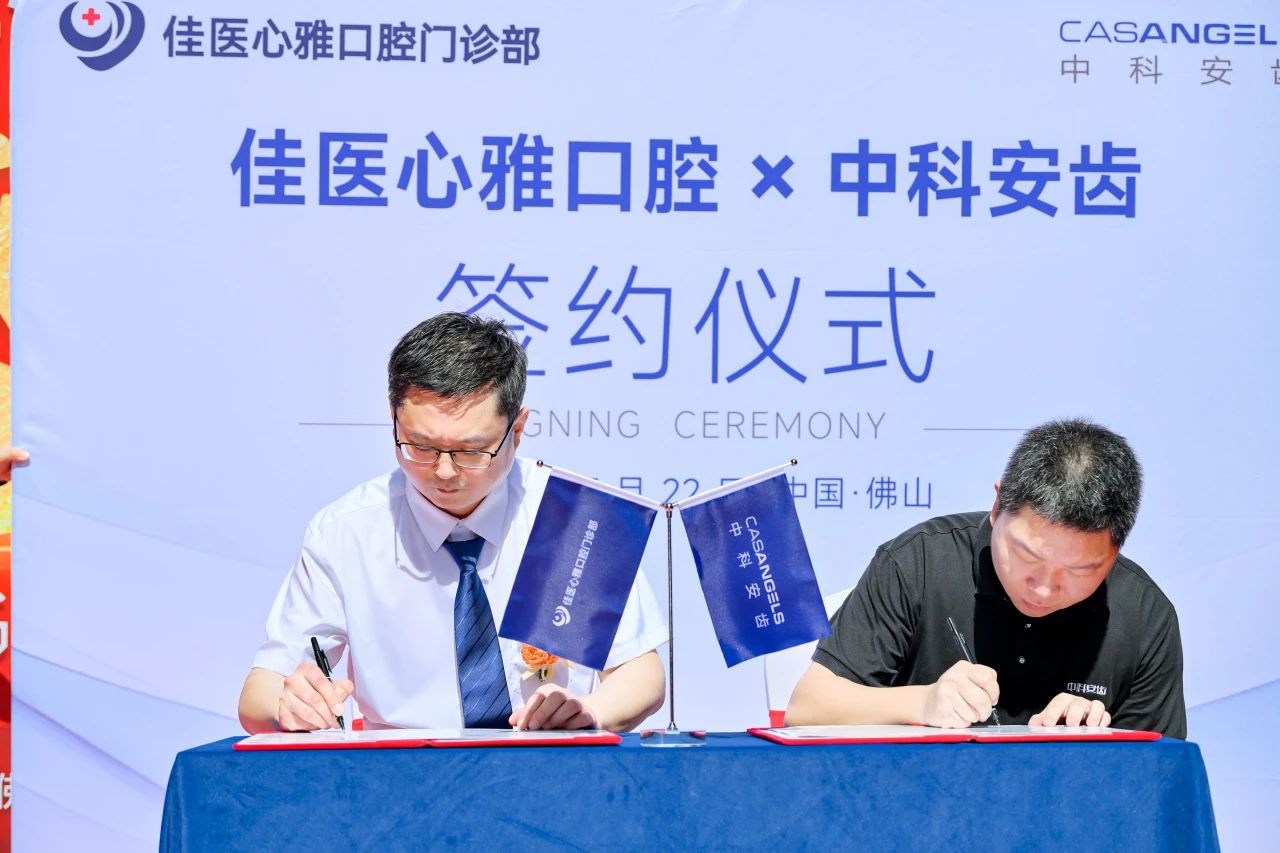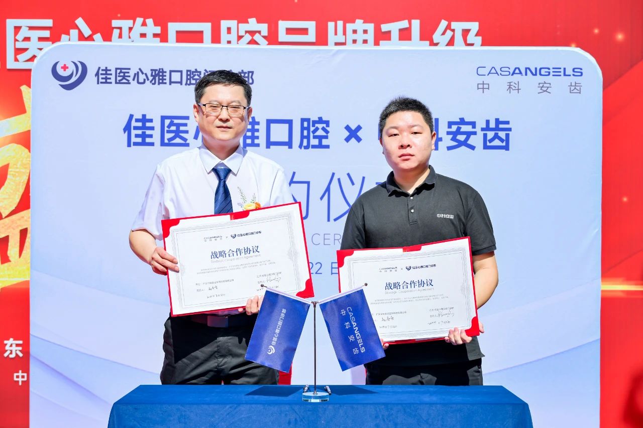 2024年7月22日, 在佳医心雅口腔的品牌升级开业庆典上,中科安齿与佳医心雅口腔举行战略合作签约仪式。双方将携手推动在口腔种植领域的临床深度合作,为患者提供更高质量的医疗服务。