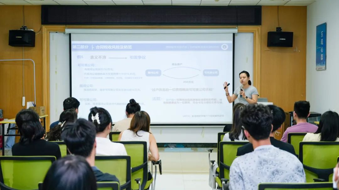 本次培训特邀佛山市律师协会税务法律专业委员会副主任、广东都汇律师事务所黄嘉莹律师主讲。黄嘉莹律师深耕税务领域十余年,曾担任税务机关法律顾问 5 年,承办多起重大涉税案件,具有丰富的实务经验和理论深度。通过 “虚开发票刑事案件”“合同条款引发的税务风险” 等真实案例,黄嘉莹律师详细讲解了企业常见的合同税务风险及防范。